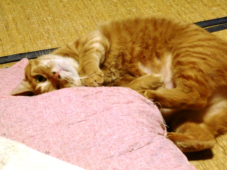 きゃこちゃん、この座布団の角が憎いらしくて、羽交い絞めにしては足でけっくりけっくりします。座布団がお前に何をした~。