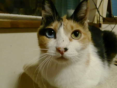 マメちゃんのアップには理由があります。先週の写真なんだけど、鼻のあたりにポツポツと汚れっぽく見えるのは、きゃこ姉ちゃんとやりあって受けた向う傷です。きゃこちゃんは絶対に爪を切らせないので、鋭いのだ。
