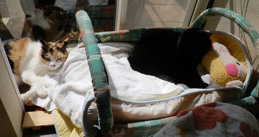 ものすごーく仲の悪いミユキちゃんと豆ちょが至近距離でくつろいでます。