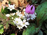 雪割草に寄りそうカタクリ。 まるで芝桜なみに咲く雪割草。