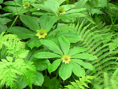 ちょっと期待していたキヌガサソウは、すでに花が終わっていて、緑のガクだけになっていました。