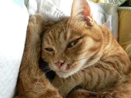 おとといあたりからかな~、我が家の茶とら、きゃっこらさんの鼻先というか、ひげの付け根あたりに傷ができました。