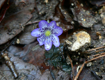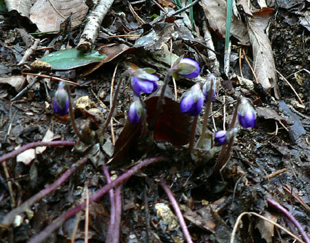 行ってみると、日陰や北向きの斜面などはまだまだ長靴がもぐりそうなほどの積雪があったものの、いつもそこだけは早く咲くポイントに1つだけ咲いている雪割草をみつけることができました。