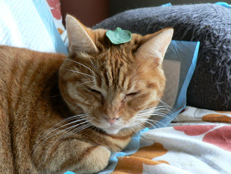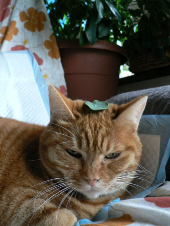 実は後ろに写っている観葉植物の葉っぱを頭に乗せたら、気がつかずにずっとそのままでいたので、写真におさめたってワケです。