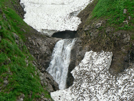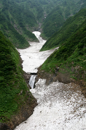 万年雪の下から夏に姿を現す滝で、さて、今年の雪の具合はどうだろう、ということで行ってきたのでした。