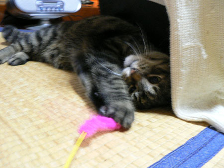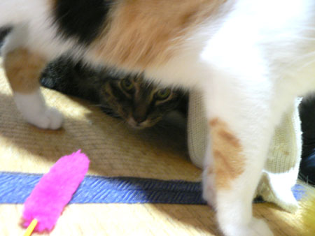 豆ちょの足の下からねこじゃらしを狙ってます。