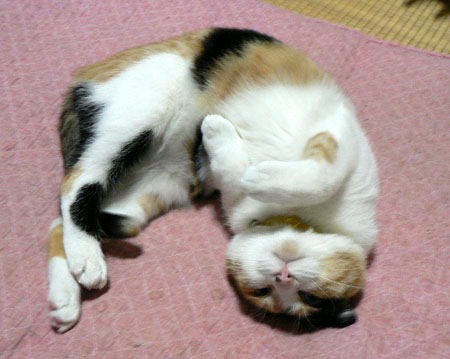 右にムチャ、左に豆ちょ、足元にきゃっこらさんが寝ているので、身動き取れない状態で寝ていたのが敗因かしらん。