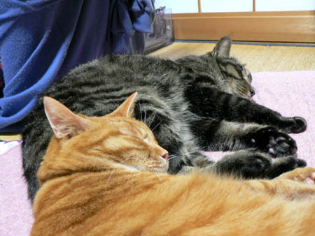 久々にムチャ登場です。ヒーターの前できゃっこらさんの枕になってます。