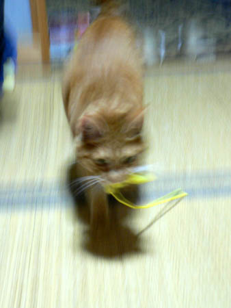 ねこじゃらしをくわえて疾走するキャッコラさん。