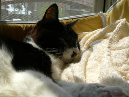 日光のあたる出窓に寝かせてあげると、とても安心した様子でぐっすりと眠りました。