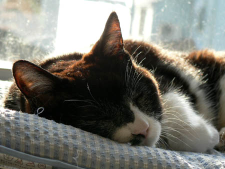 今日は自分で出窓の上に乗って、自分で日当たりのいい場所に陣取って、ぬくぬく寝ている図です。