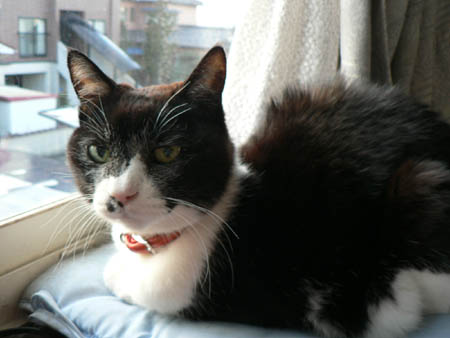 今日の暖かい日差しを浴びるために、出窓に乗ってました。