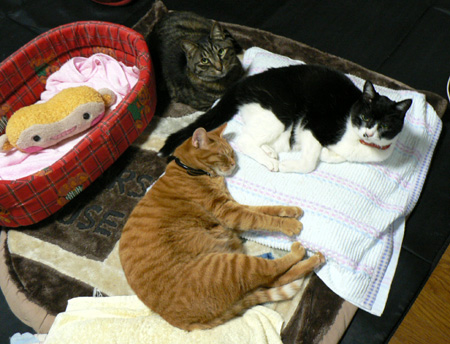 珍しく3匹がまとまってヒーターの前にいたのでバチリ。どうしてミユキちゃんはこういうシーンでも一緒にいないかなぁ。