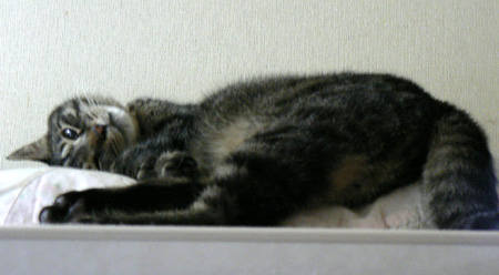 今日、ダンナが休みだったので、時間配分がおかしくなったのか、私が帰ったときにも2階にいたカッパ姉ちゃん、なんと、腰の高さくらいある出窓の上で寝てらっしゃいました。