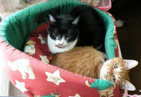 と、いうわけで、一緒の猫ベッドで猫だんごになっているカッパ姉ちゃんときゃら子です。よかったねぇ、どっちもあったかくて。