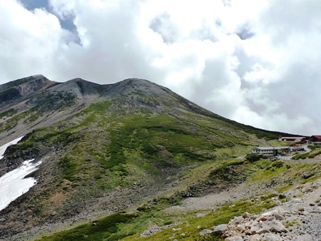 乗鞍岳は左端の高いところ。右端の建物の肩の小屋からガッツリ登るけど、1時間で登れちゃいます。山頂畳平バスターミナルからは1時間半がパンフレットのタイムです。混雑時はちょっと時間がかかるかな~。