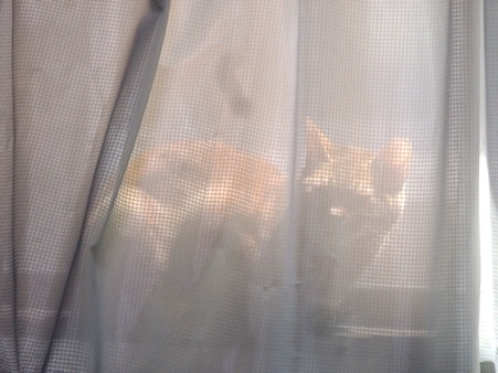 今週もきゃこちゃん。1階のきゃこ部屋には日光が入る時間が短いので、窓辺のカーテンの向こうまでお日様を追いかけます。