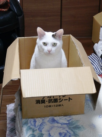 空き箱にはいってドヤ顔の九ちゃん。どーして猫ってこんなに上手く空き箱にハマるかね。