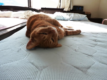 昨日のきゃこちゃん。お布団を干して広いスペースになったベッドの上でゴロンゴロンとご機嫌さんです。