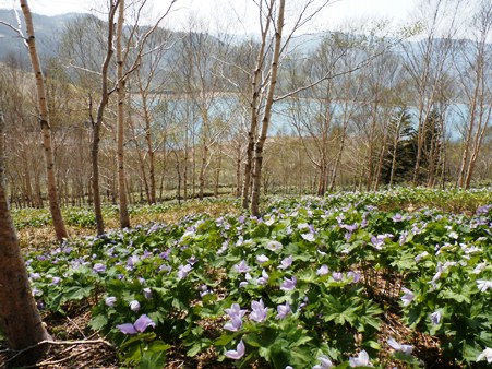 下:斜面一面ずーっとシラネアオイ。シラカバと青空が似合います。