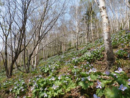 道路が眼下に通っているはずなんだけど、シラカバの林がさえぎっていて、道路からはシラネアオイは見えない状態です。