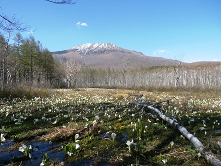 こちらの遊歩道は初めて歩いたのですが、最初の階段以外はほとんどアップダウンがなくて、白樺がきれいで、ミズバショウだらけで、快適でした。