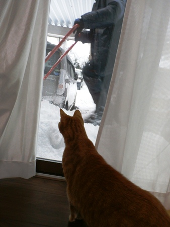 えーと、かなり前の写真です。撮影日、今年の1月24日。そーよ、大雪があった時の写真。家の床よりも高い位置の積雪をダンナがスノーダンプで片づける姿をきゃこちゃんが眺めています。この後、この夜もさらに降り、幹線道路国道8号線が歴史的な大渋滞をしたのでした。