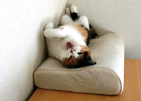本日の豆ちゃん。気持ちのいい場所で裏っかえって寝てました。みつかっちゃって、大あくびです。