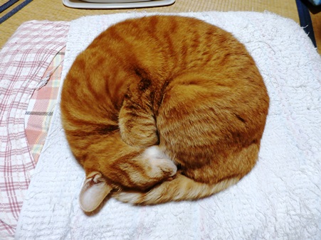 いや~、見事にまん丸くなったわね、きゃこちゃん。ヒーターの設定温度を17度のひかえめ運転にしたら猫的には寒いらしいです。ここ、ヒーターのすぐ前なんですよ。