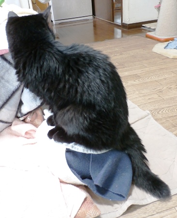 今日のミユキちゃんです。顔はね~、もう変形しちゃって、UPするのもためらわれるので、後姿ね。なんと湯たんぽの上にチンと座ってらっしゃいます。どんなになってもかわいいです。