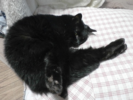 相変わらず写真にすると、どういう格好で寝ているのかさっぱりわからない黒猫です。
