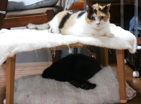 ものすごく仲の悪い2匹がミニテーブルを挟んで上下にいます。ミユキが気がついたら、大騒ぎになるんですけどね。