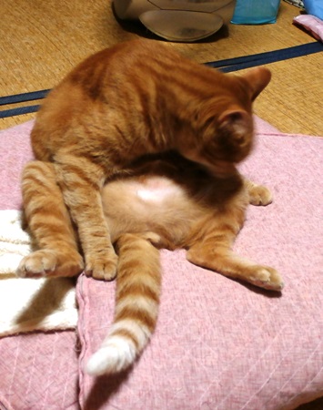 きゃこちゃん、ピンクのおなかをグルーミング中。おっさんみたいな座り方だわね。