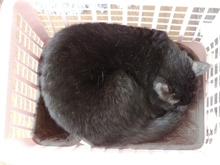 あいかわらず壁という壁がターゲットになっているんですが、今日はお風呂の脱衣室の脱衣かごにされてました。