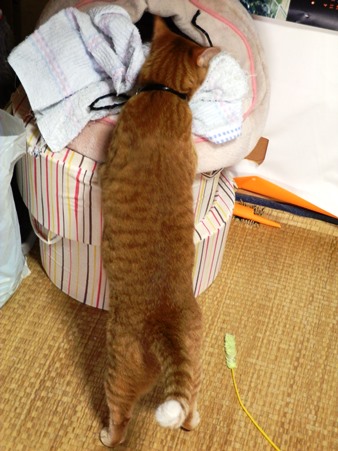 きゃこちゃん、自分のおもちゃを物色中。立ち上がった後姿がぷりてぃ~。