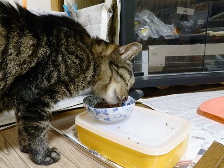 ムチャ、ごはんを食べるの図。食欲は旺盛です。でも、痩せていっているんですよね。病気だから、仕方ないけど、ちょっと辛いですよね。