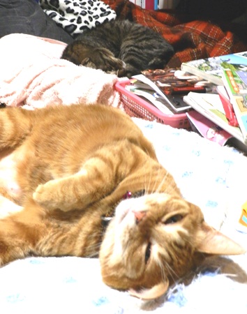 ヒーターの前で幸せなきゃっこらさんと、その奥に丸まったムチャ。