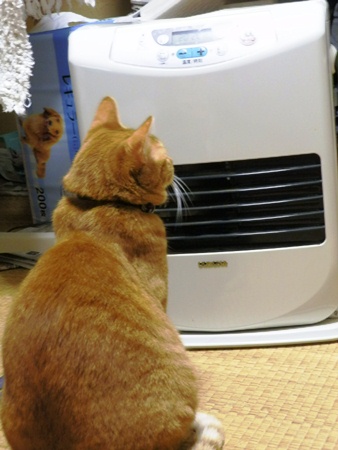 冬の風物詩、ヒーターの前に陣取るきゃっこらさんです。