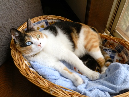窓辺の籠の中で豆ちょがくつろいでました。