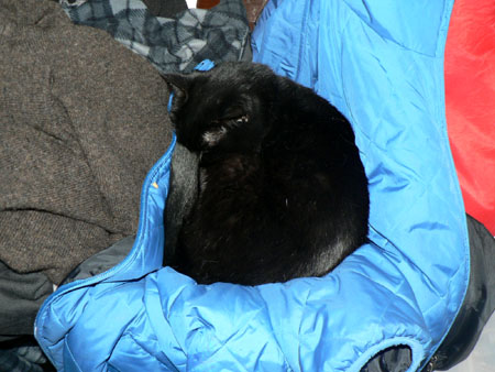 ダンナの脱ぎ散らかした衣服の上で丸くなってるミユキちゃん。