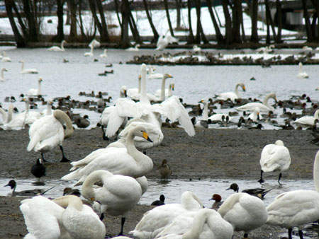 瓢湖の白鳥たちの一部。