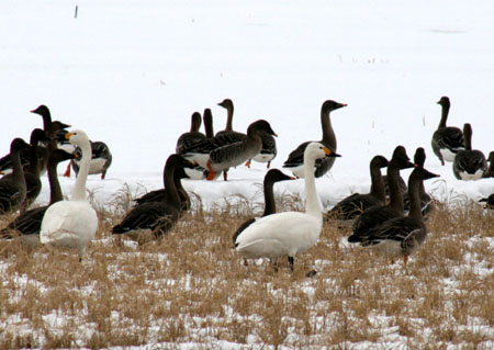 オオヒシクイとオオハクチョウが一緒にいるので、大きさがわかるでしょ。