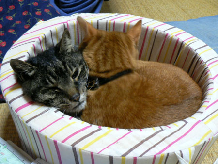 ムチャが入っていた猫ベッドにむりやりきゃっこらさんが入って、