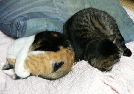 豆ちゃんとムチャがくっついて眠ってます。