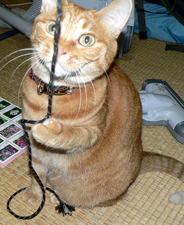 紐で遊ばれているきゃっこらさんです。