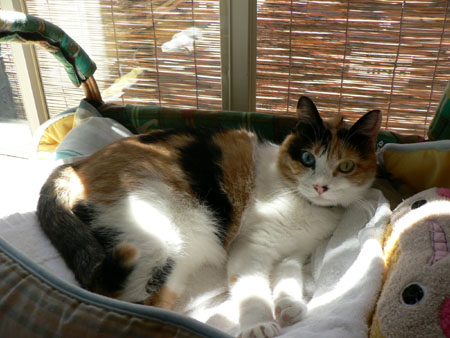 すだれからの日差しを浴びてお昼寝の豆ちゃんです。