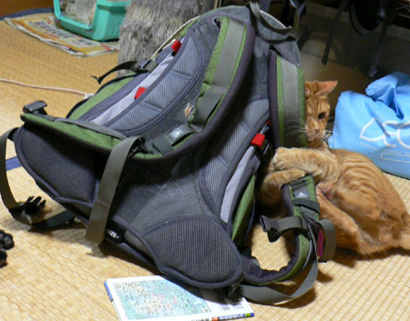 リュックについた汗のニオイにひかれて、きゃっこらさんがしがみついてます。
